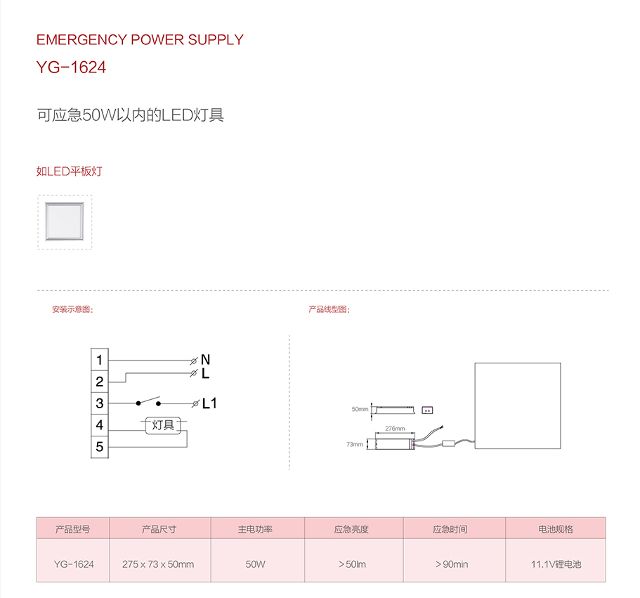 產(chǎn)品型號(hào): 1624可驅(qū)動(dòng)燈具: 50W以內(nèi)LED燈具,如平板燈應(yīng)急時(shí)間: ≥90分鐘電池類型: 鋰電池 ZD 11.1v產(chǎn)品尺寸: 275*73*50mm執(zhí)行標(biāo)準(zhǔn): GB17945-2010新國標(biāo)