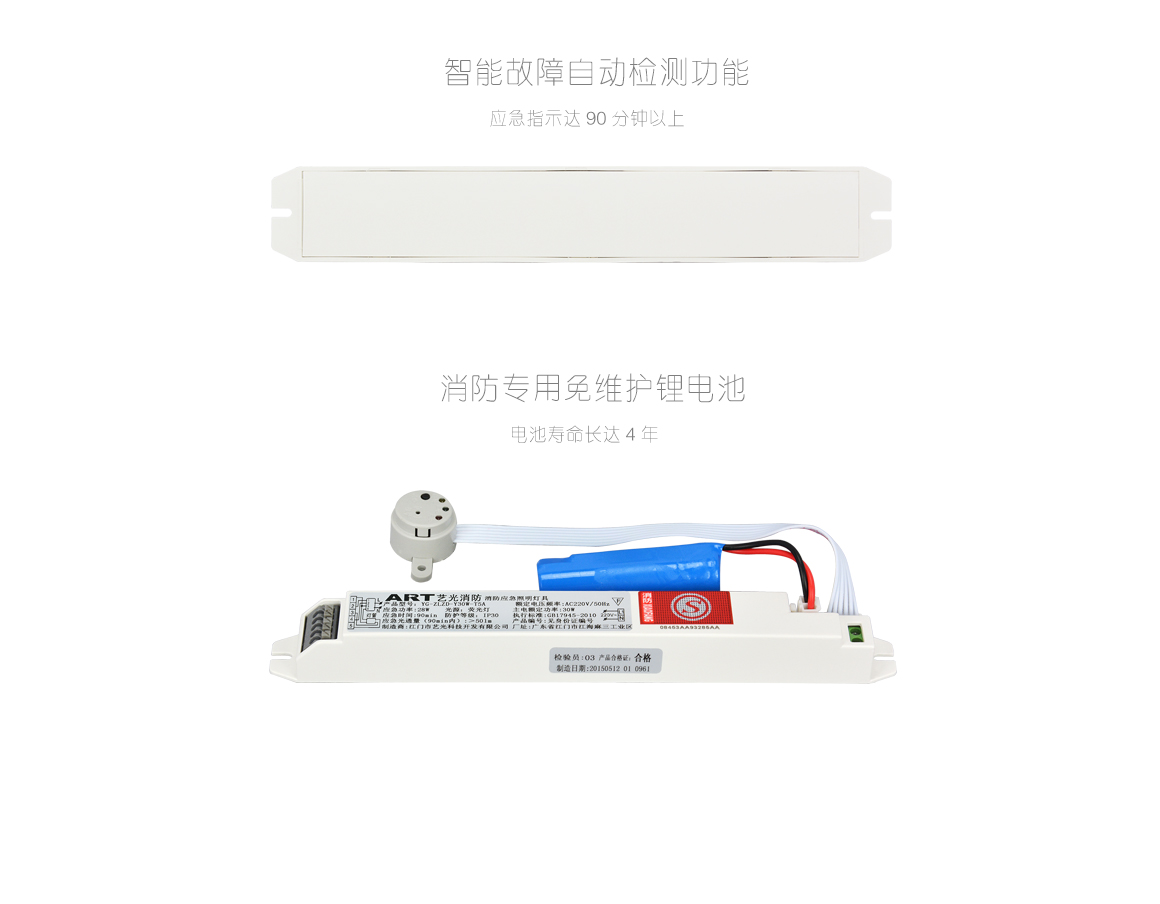 產(chǎn)品型號: T5A可驅(qū)動燈具:(28W、1.15米),(21W、0.85米),(14W、0.55米)T5熒光燈管 (36W、1.2米),(30W、0.9米),(18W、0.6米)T8熒光燈管應急時間: ≥90分鐘( 超長應急)電池類型: 鋰電池ZD3.7V 2200mAh產(chǎn)品尺寸: 282*24*22.5mm執(zhí)行標準: GB17945-2010新國標