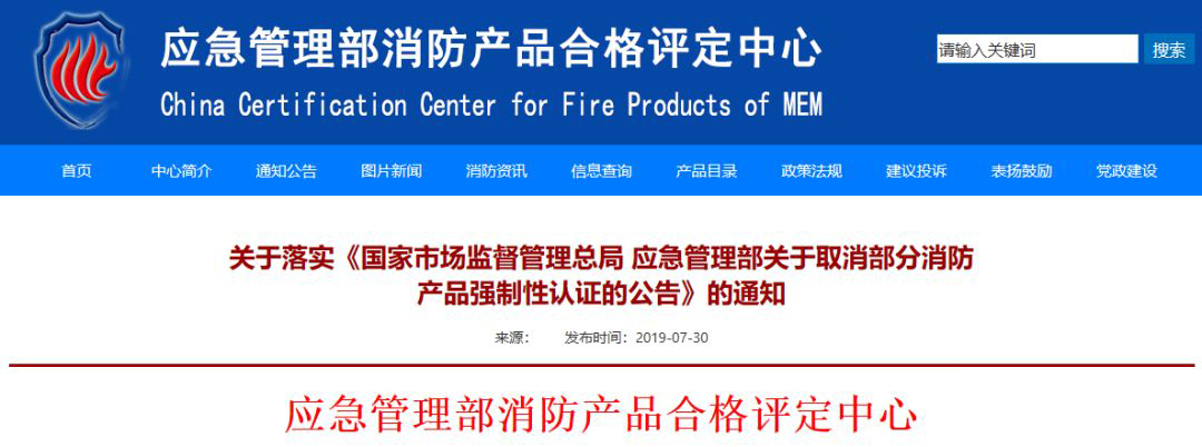 2019年7月29日,國家市場監(jiān)督管理總局、應(yīng)急管理部發(fā)布了《關(guān)于取消部分消防產(chǎn)品強(qiáng)制性認(rèn)證的公告》,對消防水帶、噴水滅火產(chǎn)品等十三類消防產(chǎn)品(含部分火災(zāi)報警產(chǎn)品)取消強(qiáng)制性產(chǎn)品認(rèn)證。公告表明,應(yīng)急管理部消防產(chǎn)品合格評定中心與各指定檢驗機(jī)構(gòu)都不再受理消防水帶、噴水滅火產(chǎn)品、消防車、滅火劑、建筑耐火構(gòu)件、泡沫滅火設(shè)備產(chǎn)品、消防裝備產(chǎn)品、火災(zāi)防護(hù)產(chǎn)品、消防給水設(shè)備產(chǎn)品、氣體滅火設(shè)備產(chǎn)品、干粉滅火設(shè)備產(chǎn)品、消防防煙排煙設(shè)備產(chǎn)品、消防通信產(chǎn)品和部分火災(zāi)報警產(chǎn)品(線型感溫火災(zāi)探測器產(chǎn)品、消防聯(lián)動控制系統(tǒng)產(chǎn)品、防火卷簾控制器產(chǎn)品和城市消防遠(yuǎn)程監(jiān)控產(chǎn)品)的強(qiáng)制性產(chǎn)品認(rèn)證委托,并統(tǒng)一注銷涉及上述產(chǎn)品的強(qiáng)制性產(chǎn)品認(rèn)證證書,中止正在認(rèn)證過程中的涉及上述產(chǎn)品的強(qiáng)制性產(chǎn)品認(rèn)證工作。