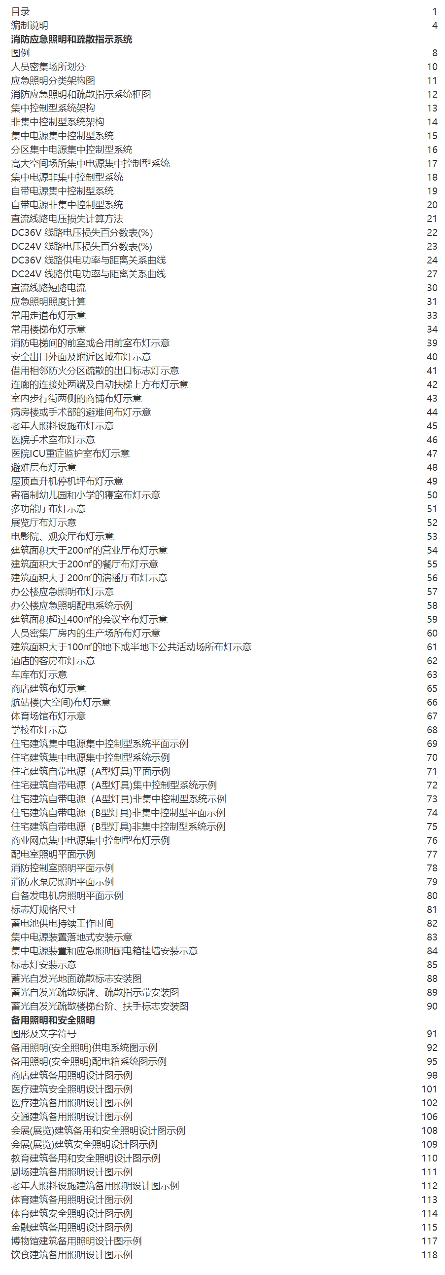 圖集適用于新建、改建和擴(kuò)建的民用建筑、通用工業(yè)建筑應(yīng)急照明(疏散照明、備用照明和安全照明)的設(shè)計(jì)與安裝。具體內(nèi)容包括:消防應(yīng)急照明和疏散指示系統(tǒng)的圖例,系統(tǒng)架構(gòu),布燈示意,示例,安裝圖等,以及備用照明和安全照明的圖形及文字符號(hào),系統(tǒng)圖示例,設(shè)計(jì)圖示例等。