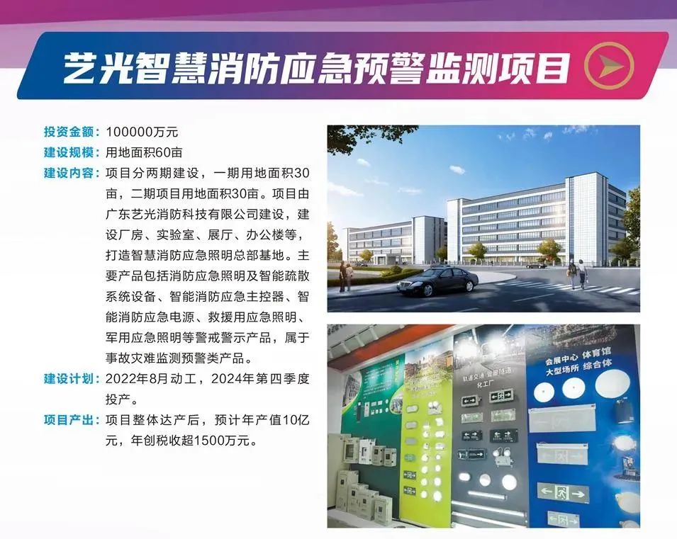 藝光智慧消防應(yīng)急預(yù)警監(jiān)測項目投資金額100000萬元,建設(shè)規(guī)模60畝,分兩期建設(shè)包括廠房、實驗室、展廳、辦公樓等,將打造成智慧消防應(yīng)急照明總部基地。主要產(chǎn)品包括消防應(yīng)急照明及智能疏散系統(tǒng)設(shè)備、智能消防應(yīng)急主控器、智能消防應(yīng)急電源、救援用應(yīng)急照明、軍用應(yīng)急照明等警戒警示產(chǎn)品,屬于事故災(zāi)難監(jiān)測預(yù)警類產(chǎn)品,預(yù)計2024年第四季度投產(chǎn)。項目整體達成后,預(yù)計年產(chǎn)值10億元,年創(chuàng)稅收超1500萬元。