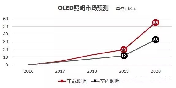 UBI 調研機構2最新發(fā)布的 OLED 照明年度報告顯示2016年 OLED 車載照明面板的市場份額大約只有2000萬元,但從2017年開始將迅速增長,并超過OLED室內照明市場,預計到2019年OLED車載照明市場份額將達到20億元。