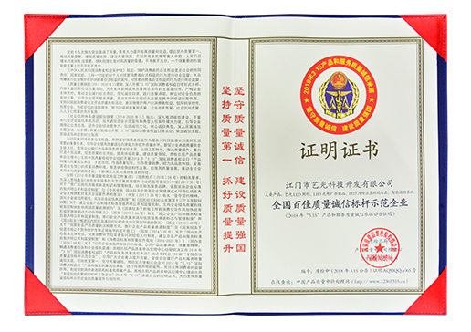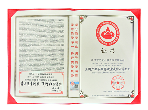 除此以外,中國質量檢驗協(xié)會針對藝光在2015-2018年度2月經(jīng)營產(chǎn)品的檢定情況、生產(chǎn)條件以及售后服務進行了全面審查,授予“全國產(chǎn)品和服務質量誠信示范企業(yè)”,并認定藝光品牌LED照明、LED光電廣告制品、LED消防應急照明燈具、智能疏散指示應急照明系統(tǒng)等全系列產(chǎn)品為“全國質量檢驗穩(wěn)定合格產(chǎn)品”